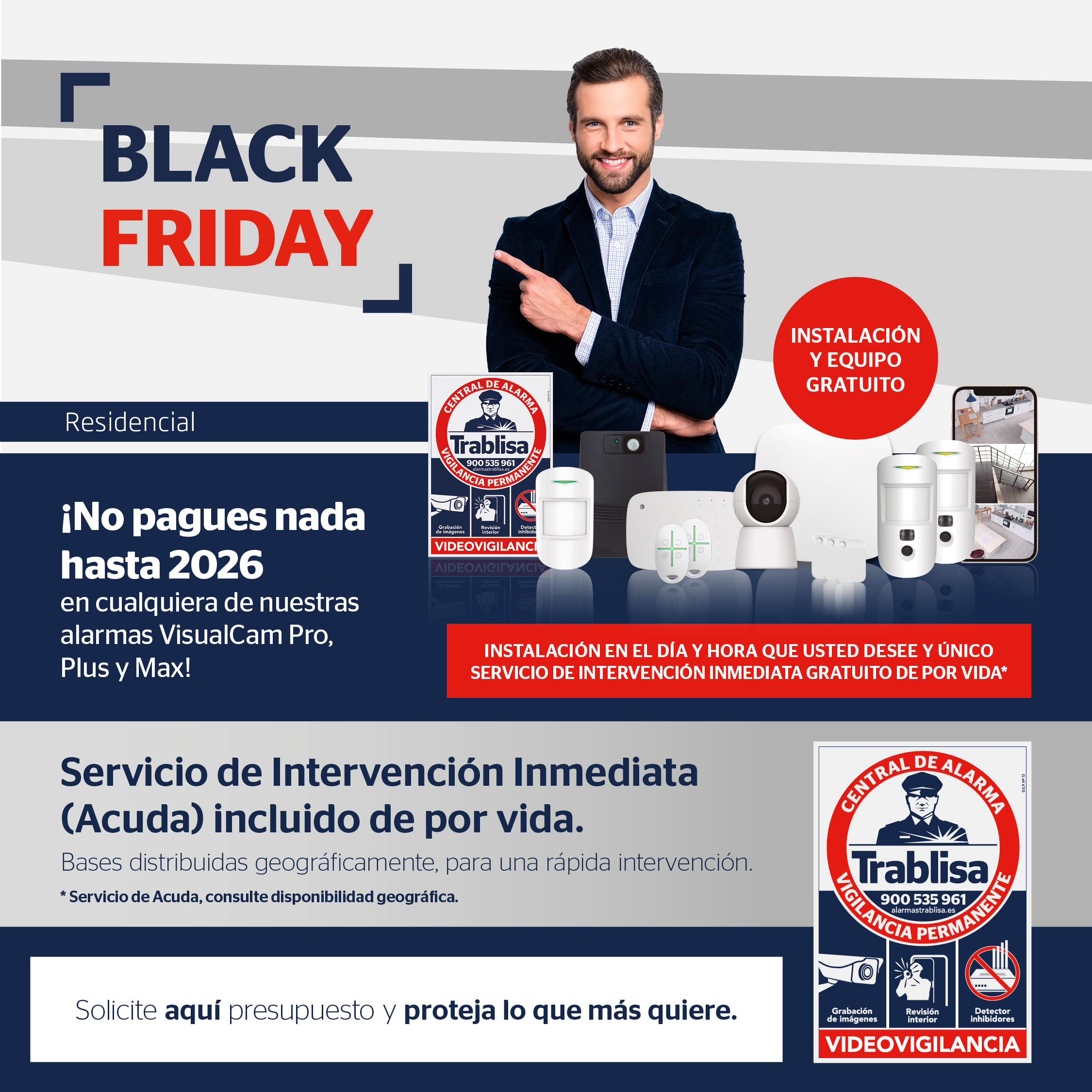 Mit mehr als 45 Jahren Erfahrung im Bereich der privaten Sicherheit bietet Trablisa Ihnen einen der umfassendsten und sichersten Sicherheitsalarme auf dem Markt, der aus modernsten technologischen Geräten besteht und von den Dienstleistungen begleitet wird, die Sie benötigen, um dies zu gewährleisten Schutz dessen, was Sie ihm mehr am Herzen liegt.